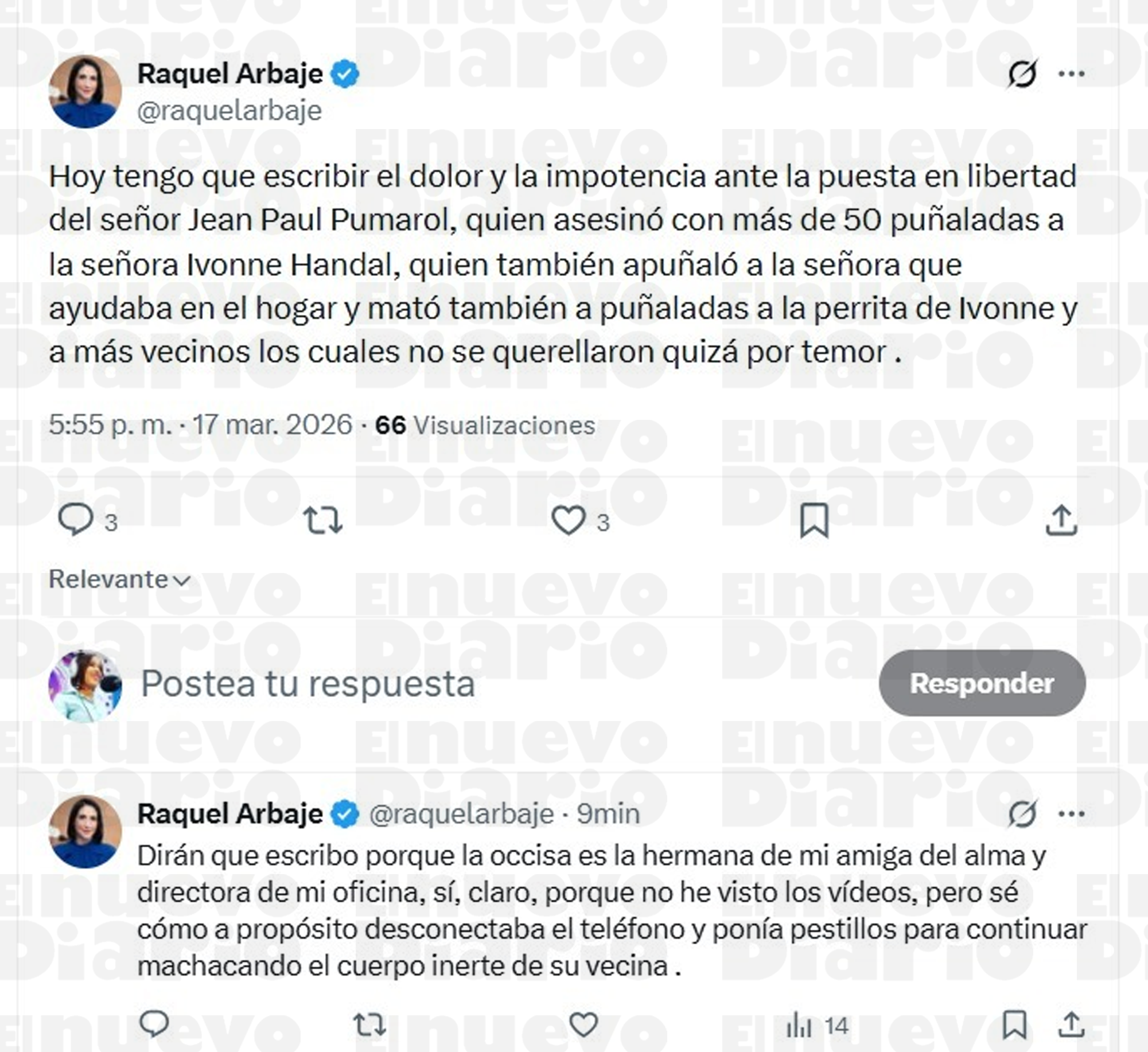 “Hoy tengo que escribir el dolor y la impotencia ante la puesta en libertad del señor Jean Paul Pumarol”, expresó Arbaje a través de sus redes sociales.